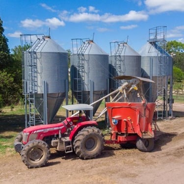 Parque de máquinas com quatro tratores, uma retroescavadeira, quatro vagões forrageiros e implementos diversos.